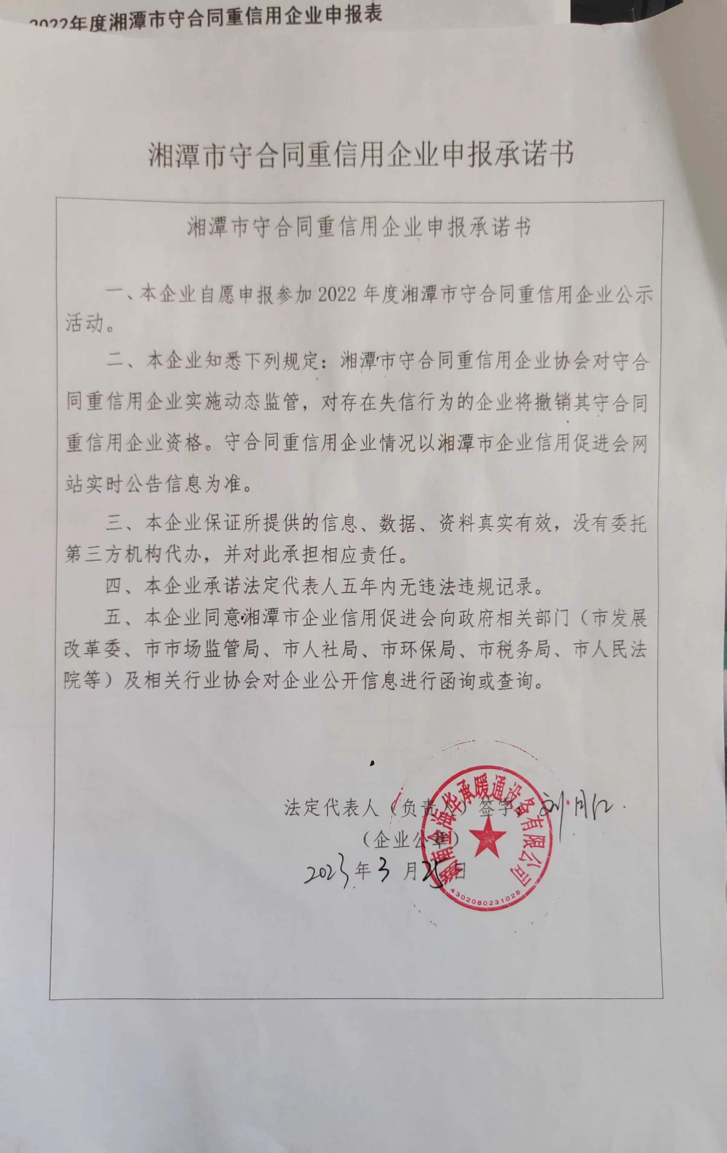 本企業(yè)根據(jù)《湘潭市守合同重信用企業(yè)申報規(guī)定》等編制 2022 年度企業(yè)信用報告書,并保證本報告書內容真實、準確、完整。