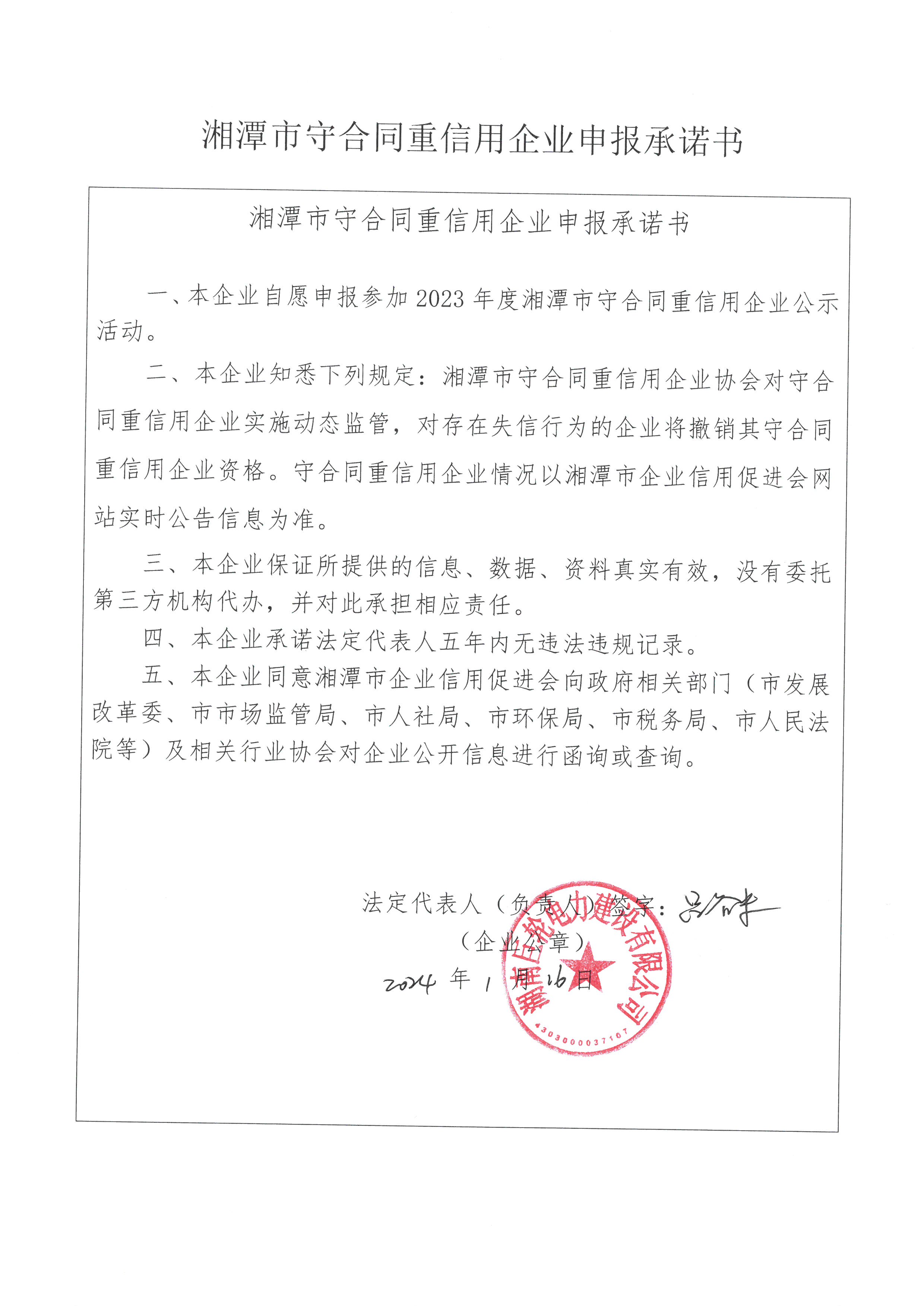 本企業(yè)根據(jù)《湘潭市守合同重信用企業(yè)申報(bào)規(guī)定》等編制 2023 年度企業(yè)信用報(bào)告書,并保證本報(bào)告書內(nèi)容真實(shí)、準(zhǔn)確、完整。
