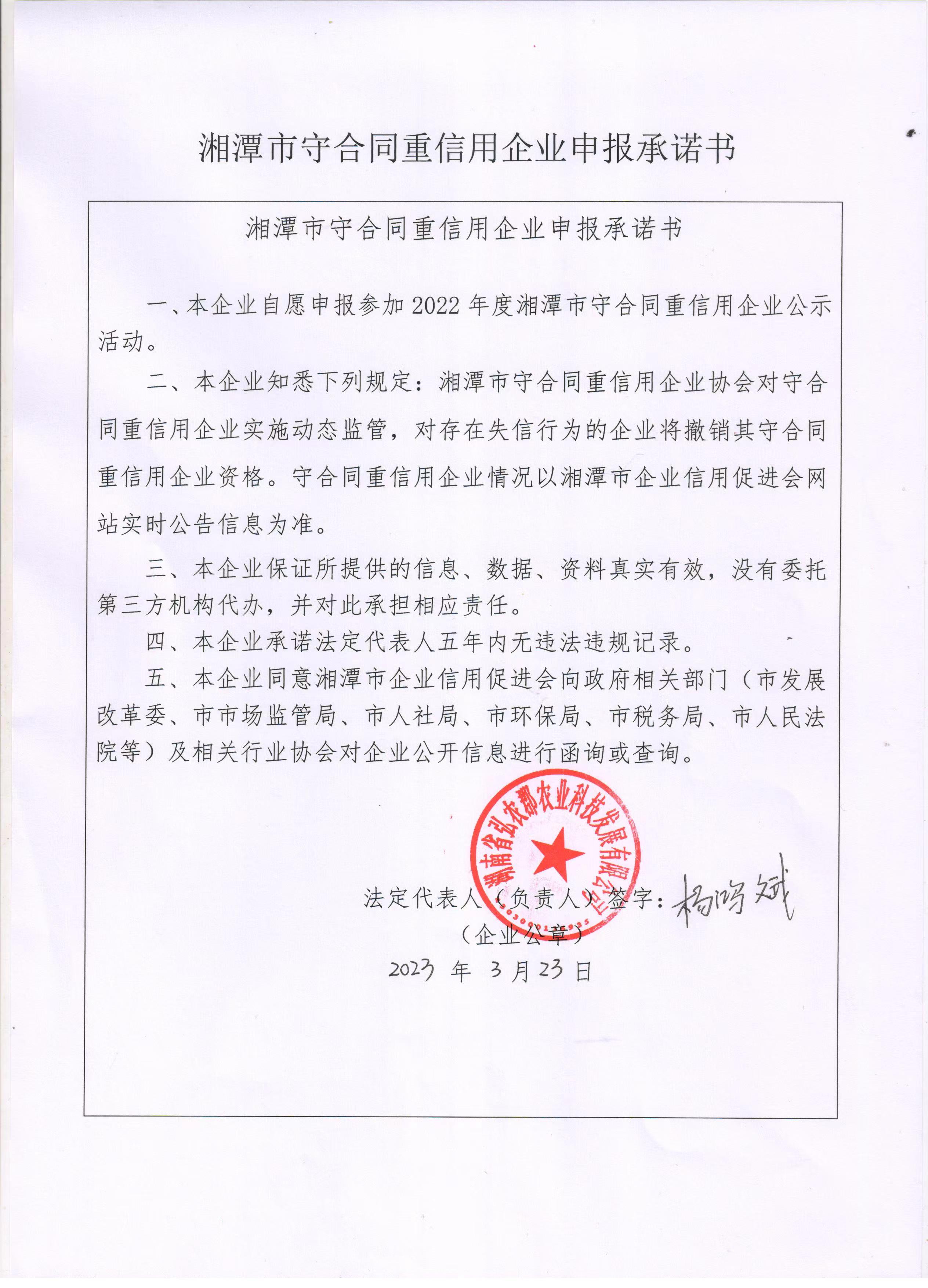 本企業(yè)根據(jù)《湘潭市守合同重信用企業(yè)申報規(guī)定》等編制 2022 年度企業(yè)信用報告書,并保證本報告書內(nèi)容真實、準確、完整。