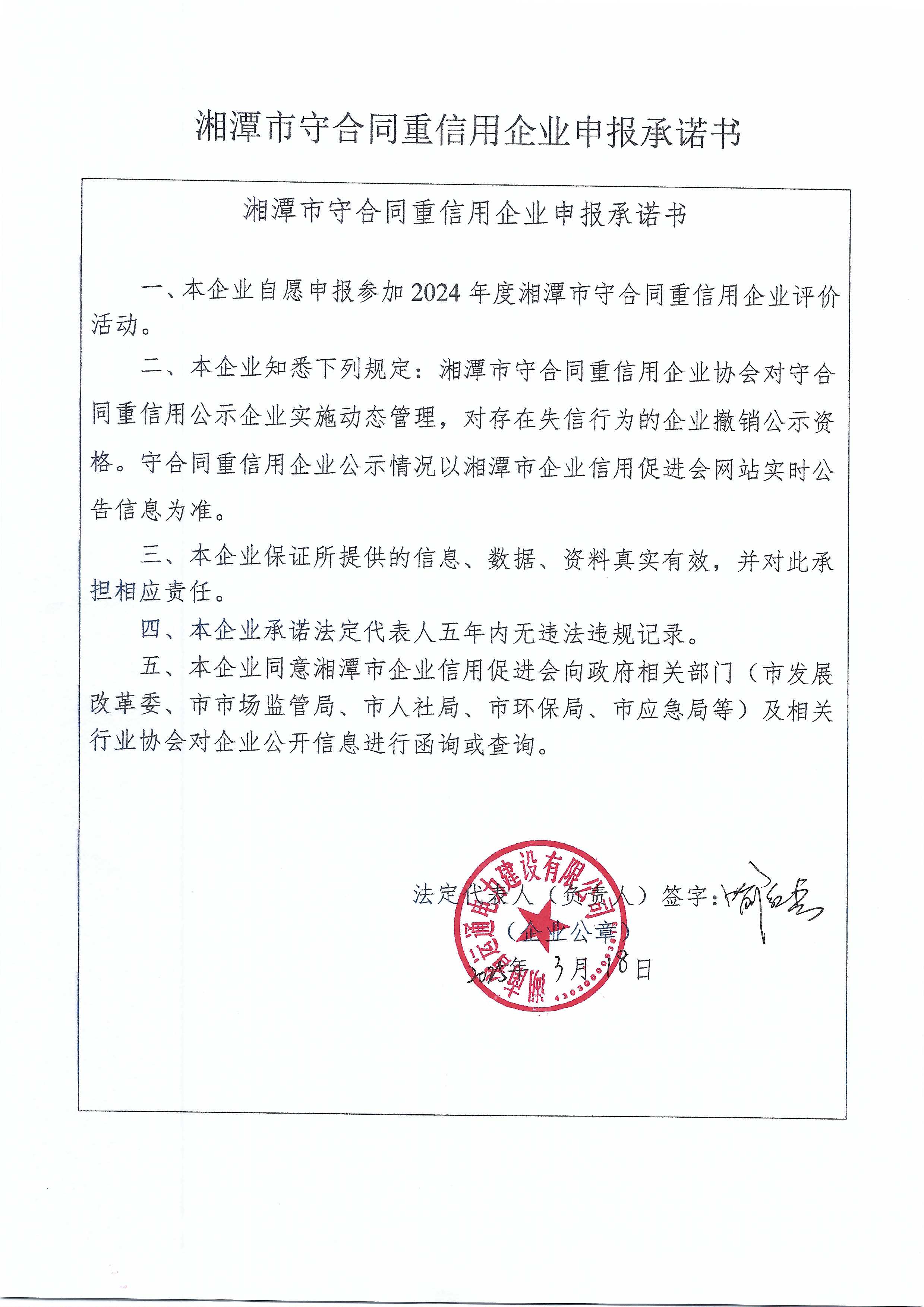本企業(yè)根據(jù)《湘潭市守合同重信用企業(yè)申報規(guī)定》等編制 2024 年度企業(yè)信用報告書,并保證本報告書內(nèi)容真實、準(zhǔn)確、完整。