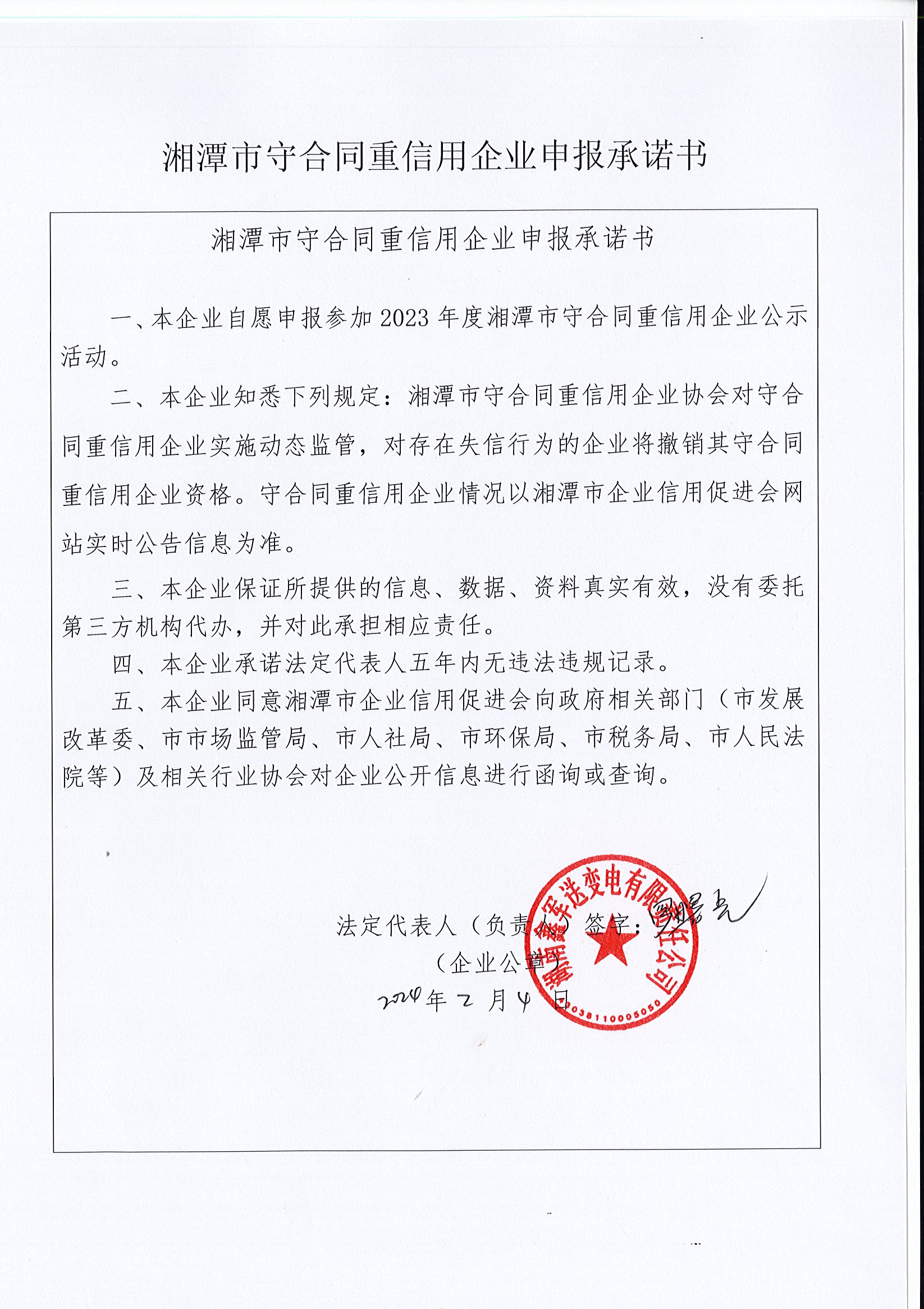 本企業(yè)根據(jù)《湘潭市守合同重信用企業(yè)申報規(guī)定》等編制 2023 年度企業(yè)信用報告書,并保證本報告書內(nèi)容真實、準確、完整。