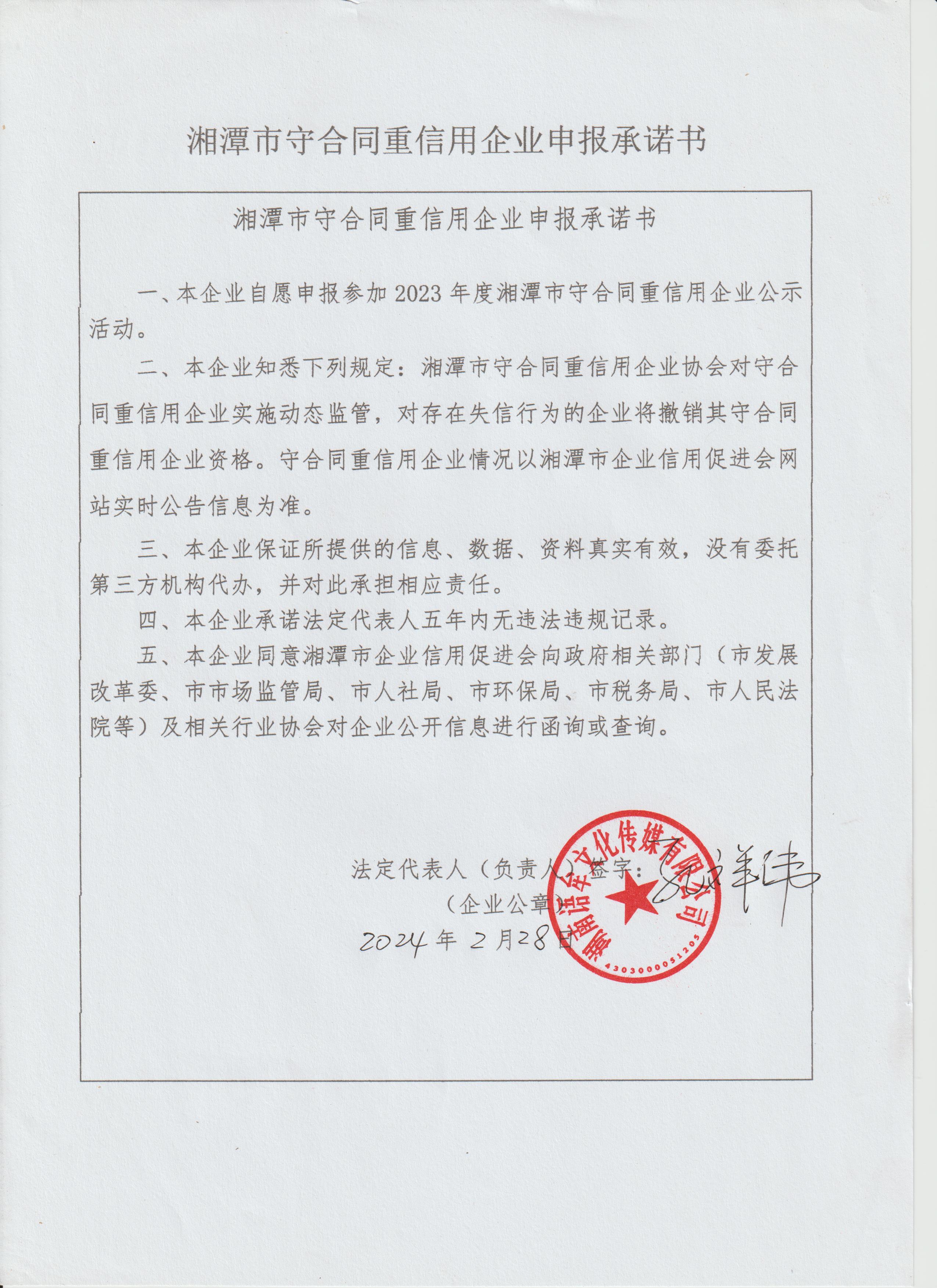 本企業(yè)根據(jù)《湘潭市守合同重信用企業(yè)申報(bào)規(guī)定》等編制 2023 年度企業(yè)信用報(bào)告書,并保證本報(bào)告書內(nèi)容真實(shí)、準(zhǔn)確、完整。