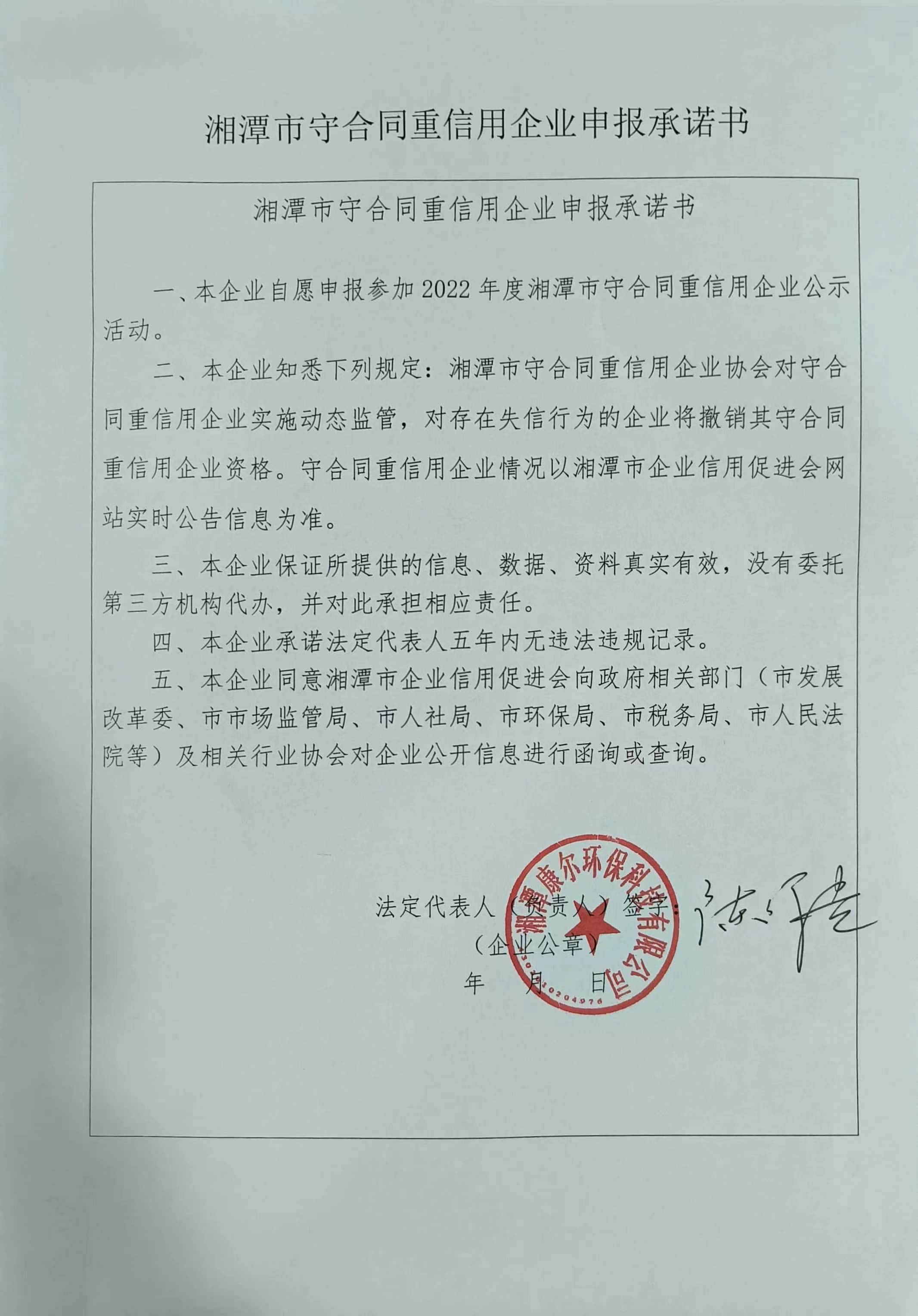 本企業(yè)根據(jù)《湘潭市守合同重信用企業(yè)申報規(guī)定》等編制 2022 年度企業(yè)信用報告書,并保證本報告書內(nèi)容真實、準(zhǔn)確、完整。