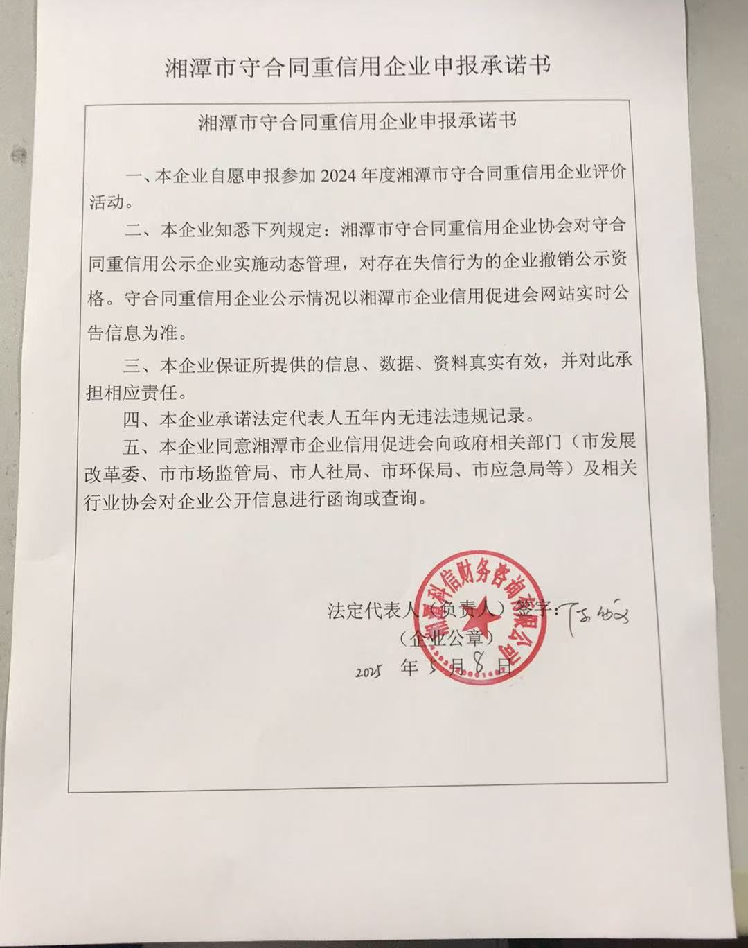 本企業(yè)根據(jù)《湘潭市守合同重信用企業(yè)申報規(guī)定》等編制 2024 年度企業(yè)信用報告書,并保證本報告書內容真實、準確、完整。